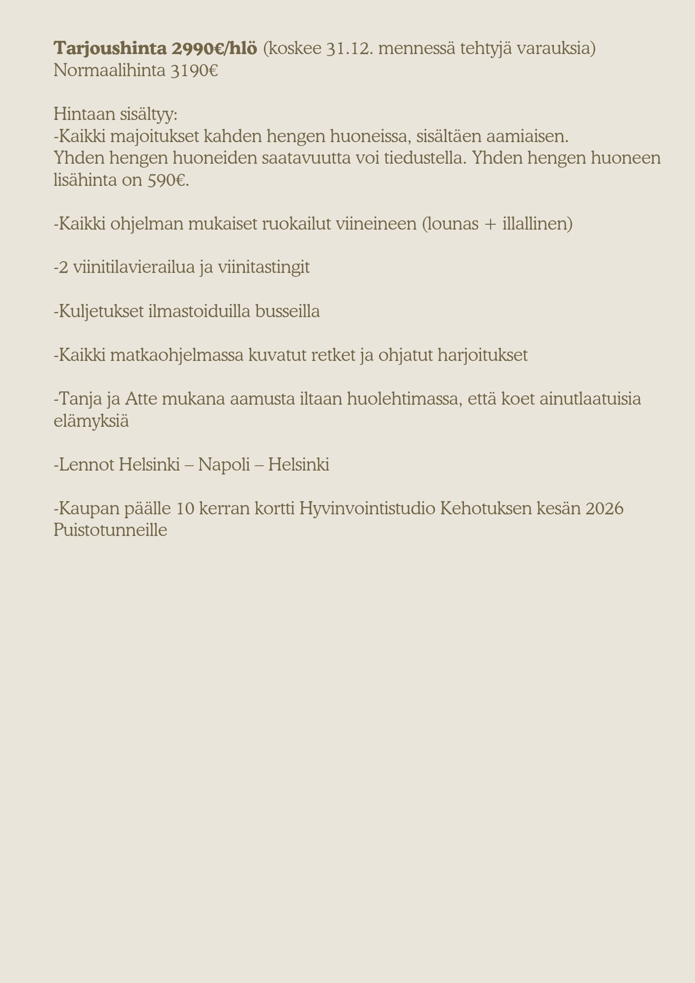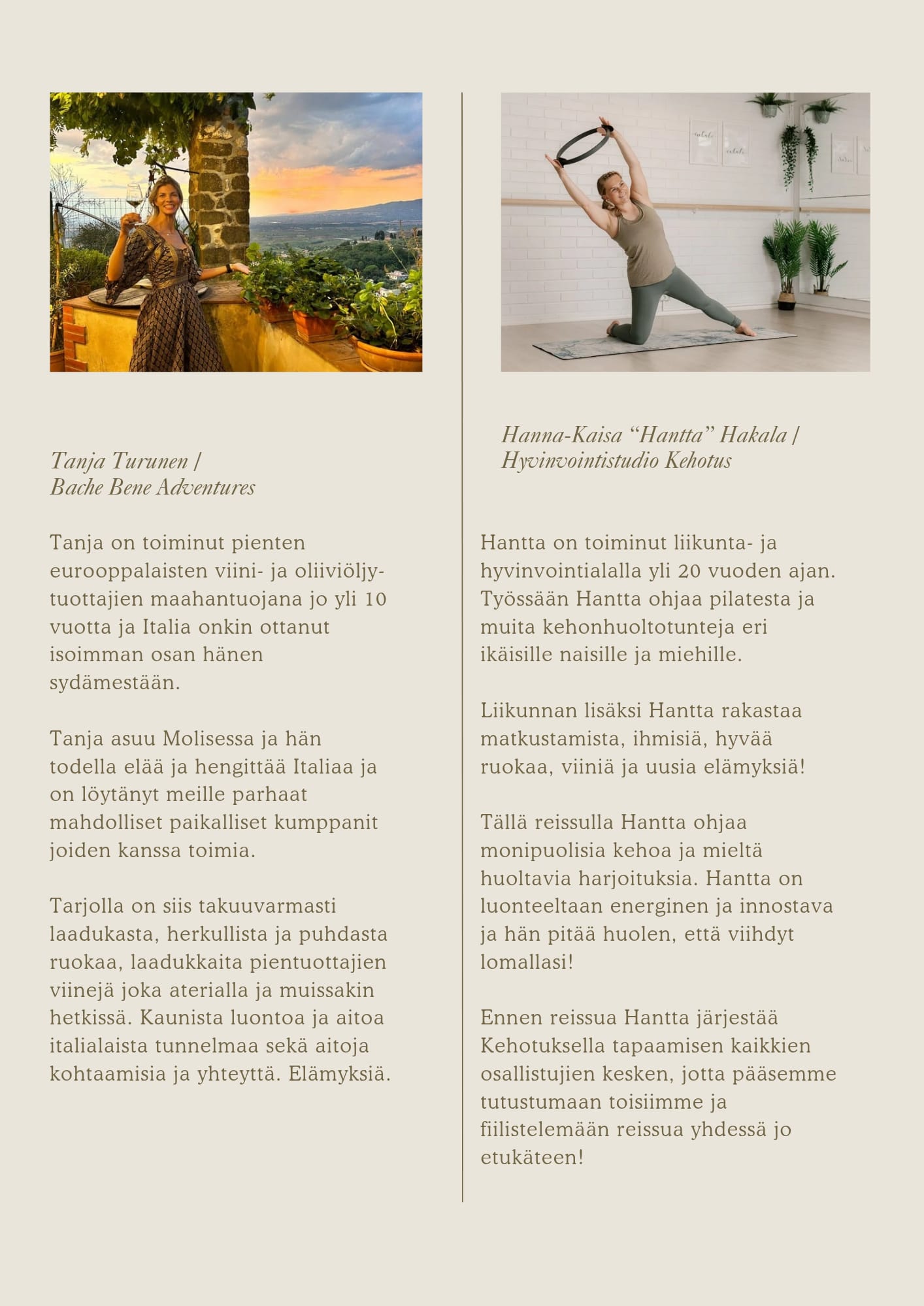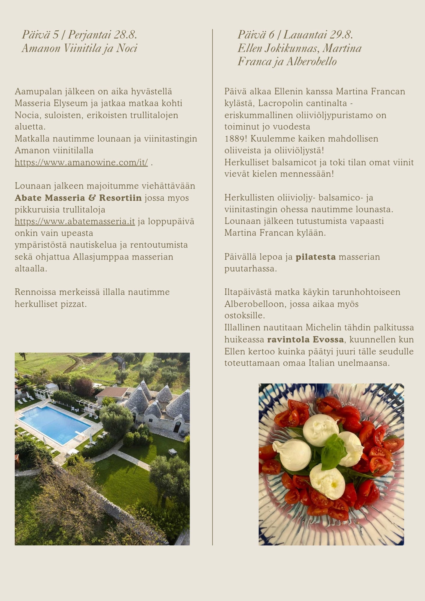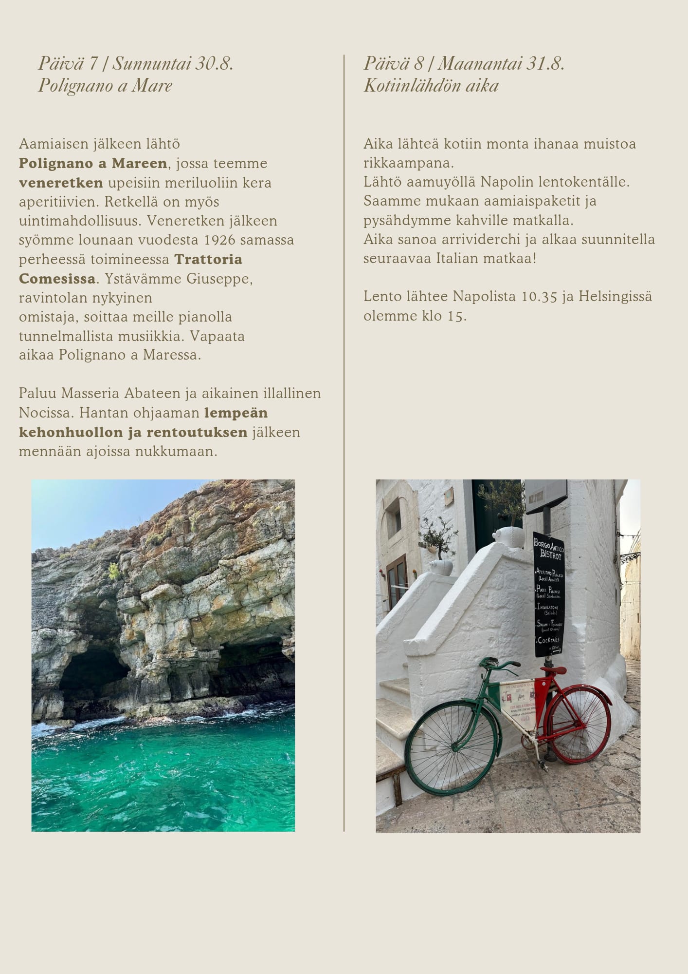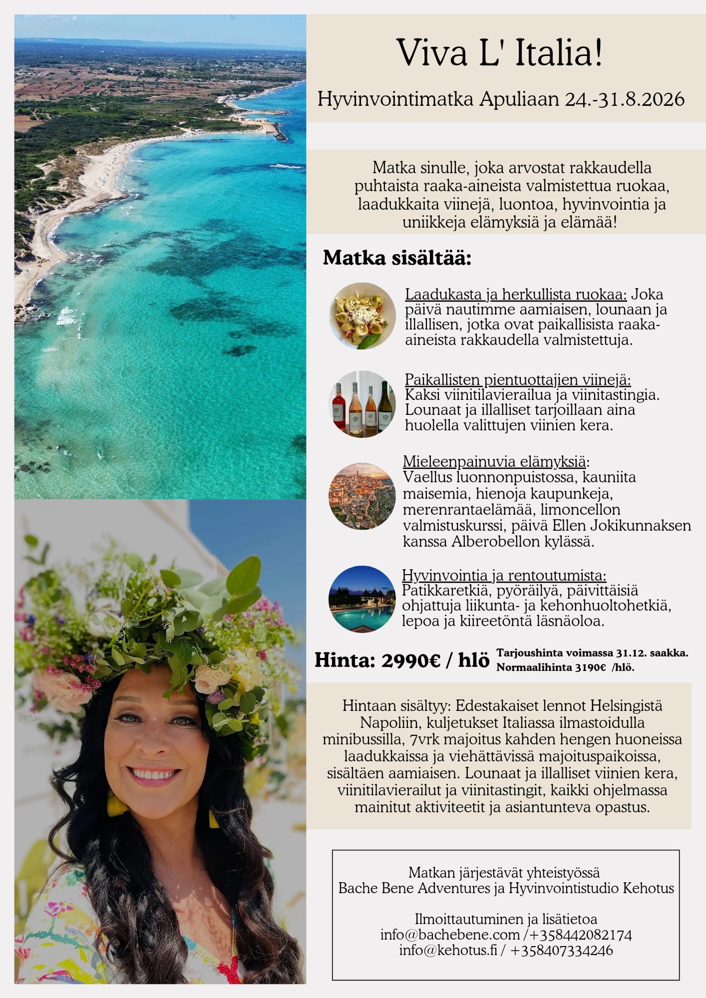Seuraava VIVA L`ITALIA Hyvinvointimatka Apuliaan 24.-31.8.2026 3 vapaata paikkaa! ILMOITTAUTUMINEN JA LISÄTIETOA Tanjalle tai Hantalle: tanja@bachebene.com / 044-2082174 info@kehotus.fi /040-7334246